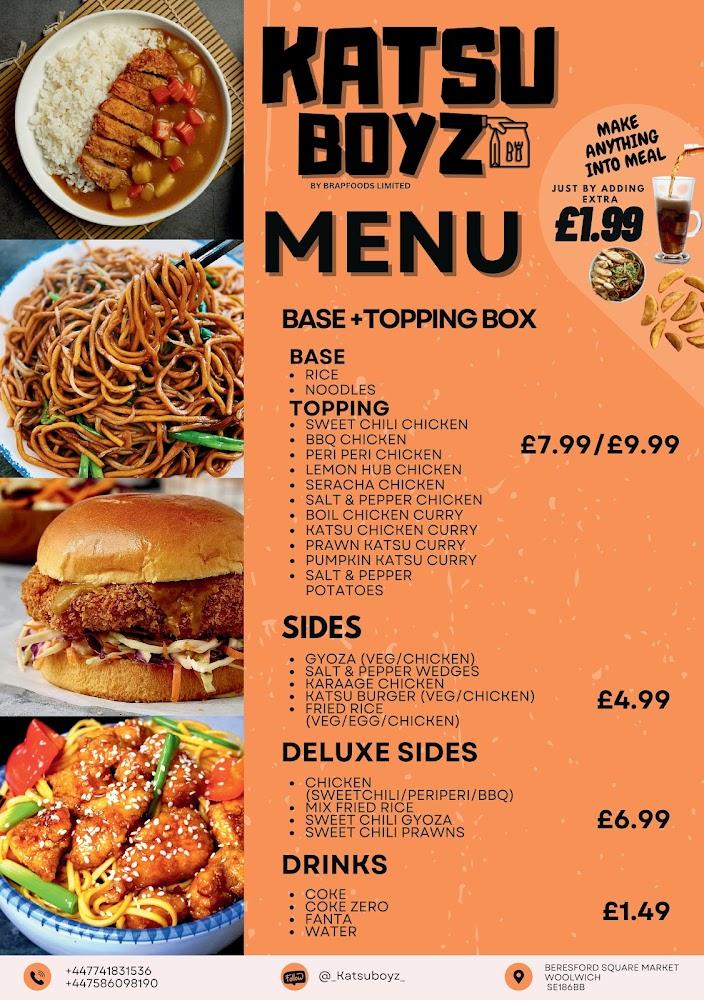 Located at General Gordon Pl, Katsu Boyz stands out in the bustling culinary landscape of Woolwich, London SE18. This diverse area is famous for its rich history and cultural melting pot, making it the perfect backdrop for Katsu Boyz's vibrant Asian street food offerings. The restaurant thrives on the go-getter spirit of locals who seek quick bites packed with bold flavors, whether it’s at lunch breaks or for dinner with family friends. The atmosphere here is undeniably casual, inviting everyone, from solo diners craving a quick meal to families looking for a satisfying dinner. Katsu Boyz embraces community with outdoor seating options, ensuring diners enjoy their meals al fresco amid the local hustle and bustle. Additionally, its convenient service options, including drive-through and no-contact delivery, cater to the modern food lover's needs. With a phone call away at +44 7586 098190, getting your katsu fix is just a moment's notice.